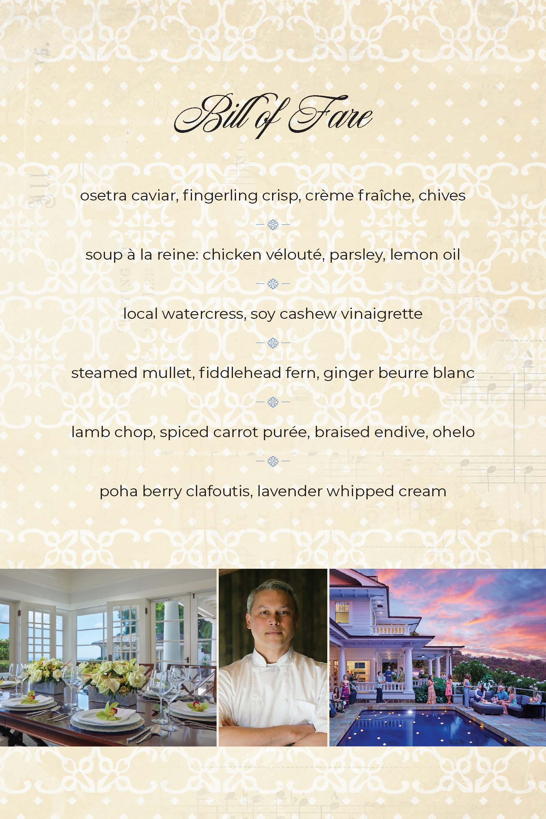 The regal menu for the event will be prepared by Chef Daryl Murumoto.