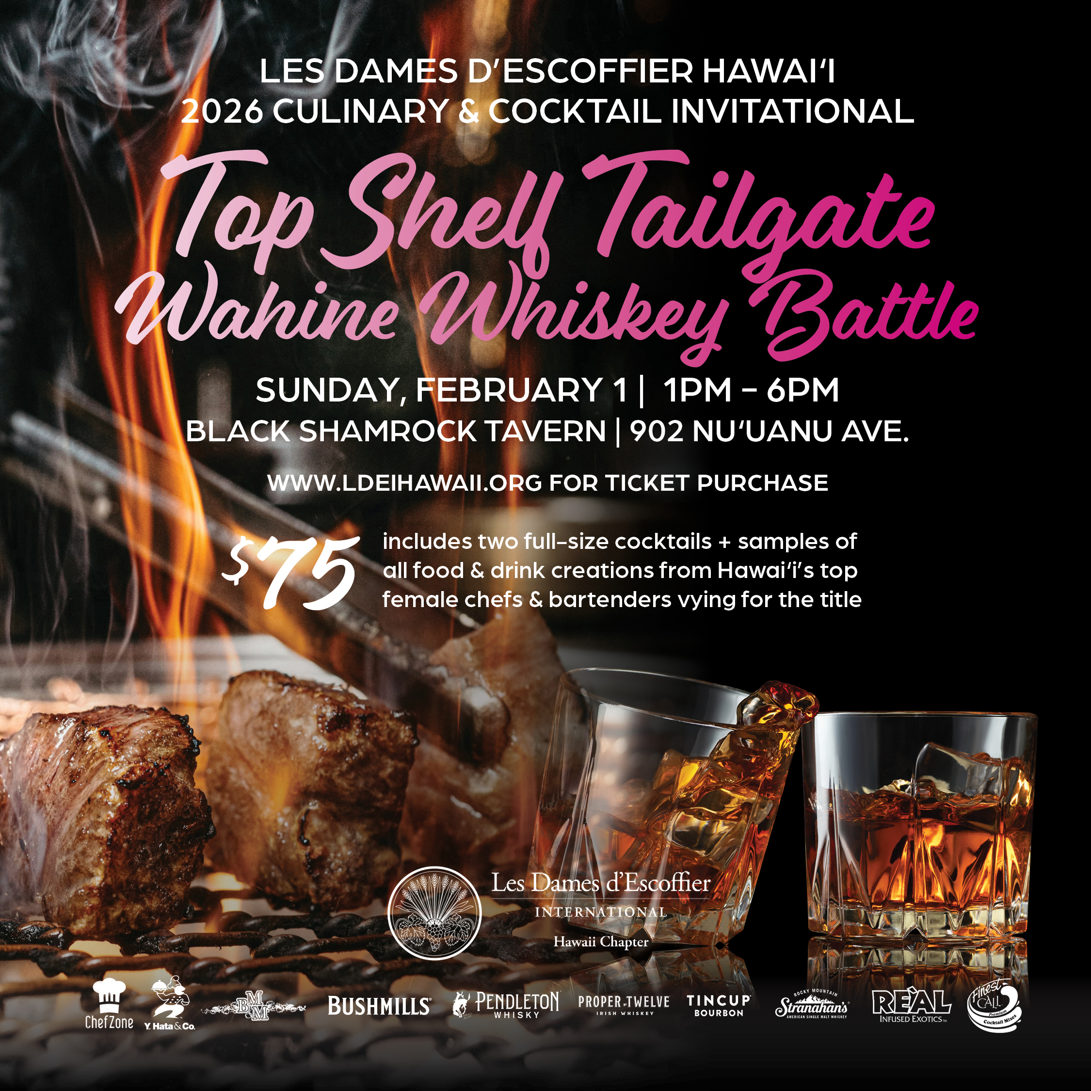 Come see Hawaii’s top female chefs and expert female mixologists battle for cash, prizes and the title in the Top Shelf Tailgate 2026 Les Dames d'Escoffier Culinary & Cocktail Invitational. A fundraiser for our LDEI Hawaii philanthropic endeavors. Mahalo to our sponsors and Black Shamrock Tavern, our host once again for this fun event. Each...